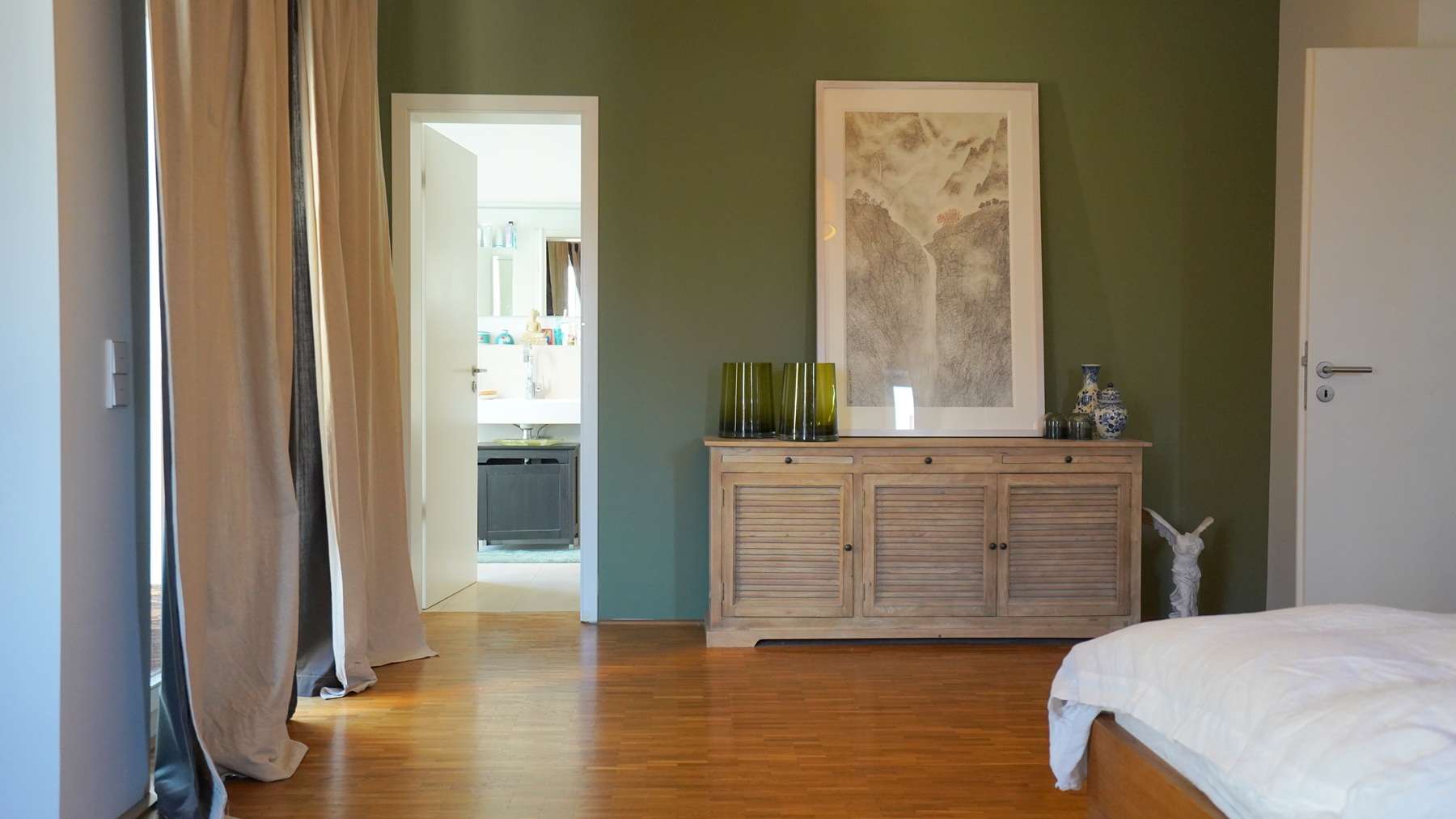 - Großes Schlafzimmer (ca. 28 m²) mit Loggia und mit Vollbad ensuite (ca. 10 m²)
