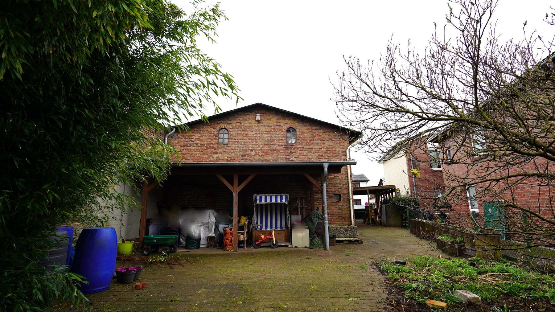 Der große Schuppen im Garten wird nicht nur Hobbyhandwerker und Künstler erfreuen. Die überdachte Terrasse zum Garten hin schützt Sie vor Wind und Wetter.