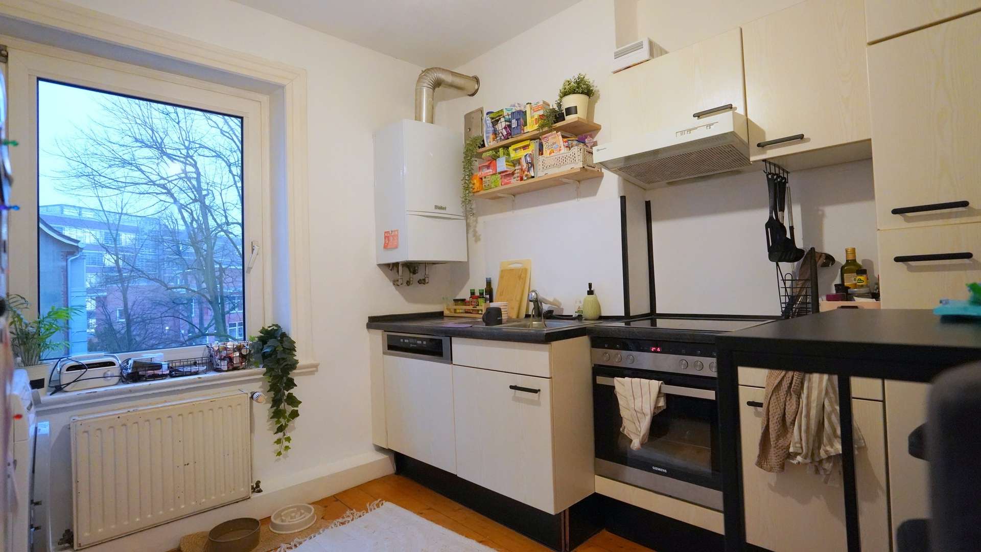 Die große Küche bietet genug Platz und Anschlüsse für Waschmaschine und Geschirrspüler. Das kleine Hamburger Duschbad bietet auch Licht von außen. Die Beheizung erfolgt über eine Gas-Etagenheizung.